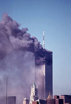 Tower 1 continues to burn following the collapse of tower 2 at 9:59 AM.