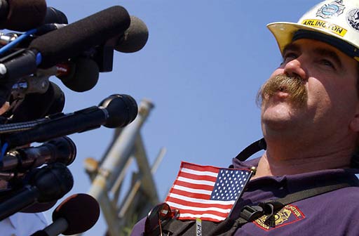 Arlington Fire Captain Scott McKay speaks to reporters on a hill southwest of the Pentagon. McKay was attending a counter-terrorism class in the District when he learned about the crash.